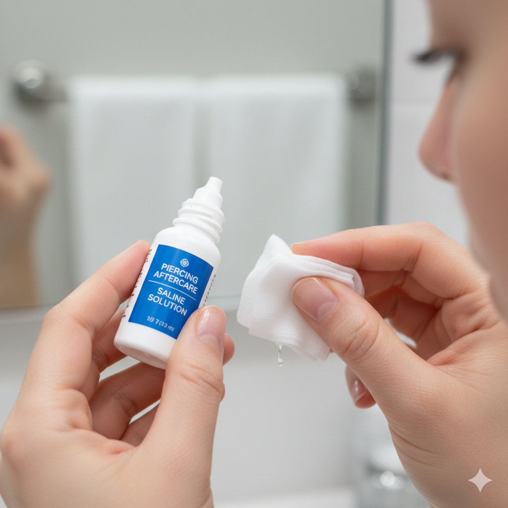 SALINE rinse as needed during healing. For certain placements it may be easier to apply using clean gauze saturated with saline solution. A brief rinse afterward will remove any residue. If your piercer suggests using soap, gently lather around the piercing and rinse as needed. Avoid using harsh soaps, or soaps with dyes, fragrances, or triclosan.